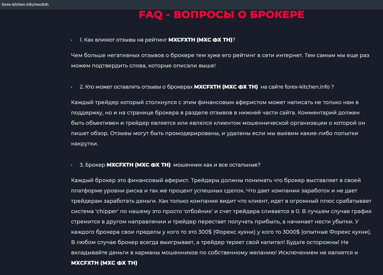 MXCFXTH - это очередная форекс-контора, которая смогла обворовать уже не одну сотню людей, предлагая торговлю на рынке Форекс. Все кто повелся на их обещания и липовые условия, очень пожалел об этом. Контора даже не смогла сделать нормальный сайт, не говоря уже обо все остальном. Поэтому не ведитесь на лохотрон МХС ФХ ТН!!!