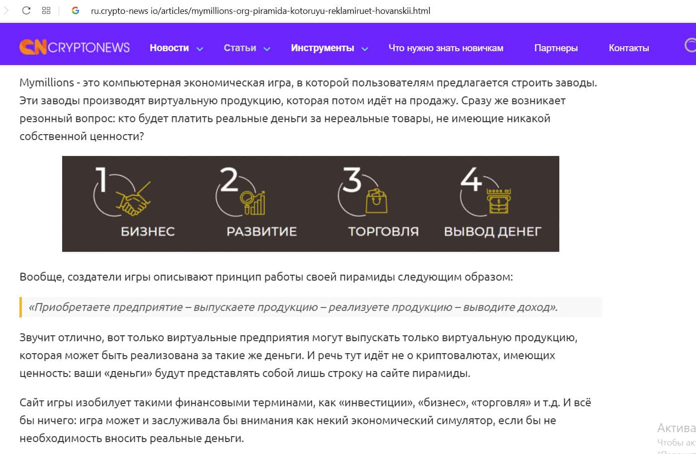 Сайт crypto-news io опубликовал разгромную статью, полностью разоблачающую псевдоэкономическую стратегию Май Миллионс. Авторы статьи указывают на необходимость вкладывать реальные деньги в виртуальные предприятия. На сайте игры все просто: купил завод, выпустил продукцию, вывел деньги.