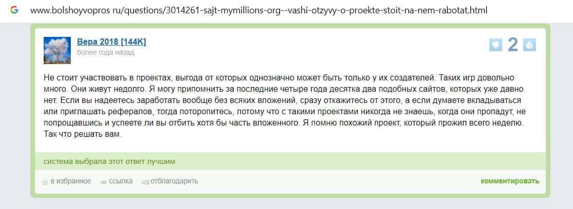 - Комментарий на сайте Большойвопрос об игре Май Миллионс: не стоит участвовать в таких сомнительных проектах