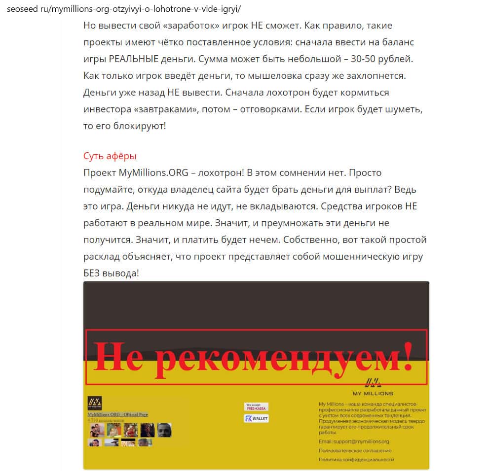 Сайт seoseed ru, который выкладывает разоблачения мошеннических компаний, написал статью и про Май Миллионс. В ней рассказывается схема развода, которую используют разработчики игры. Сначала игроку дают бонусы и подарки, чтобы он увлекся игрой и думал, что будет здесь зарабатывать.