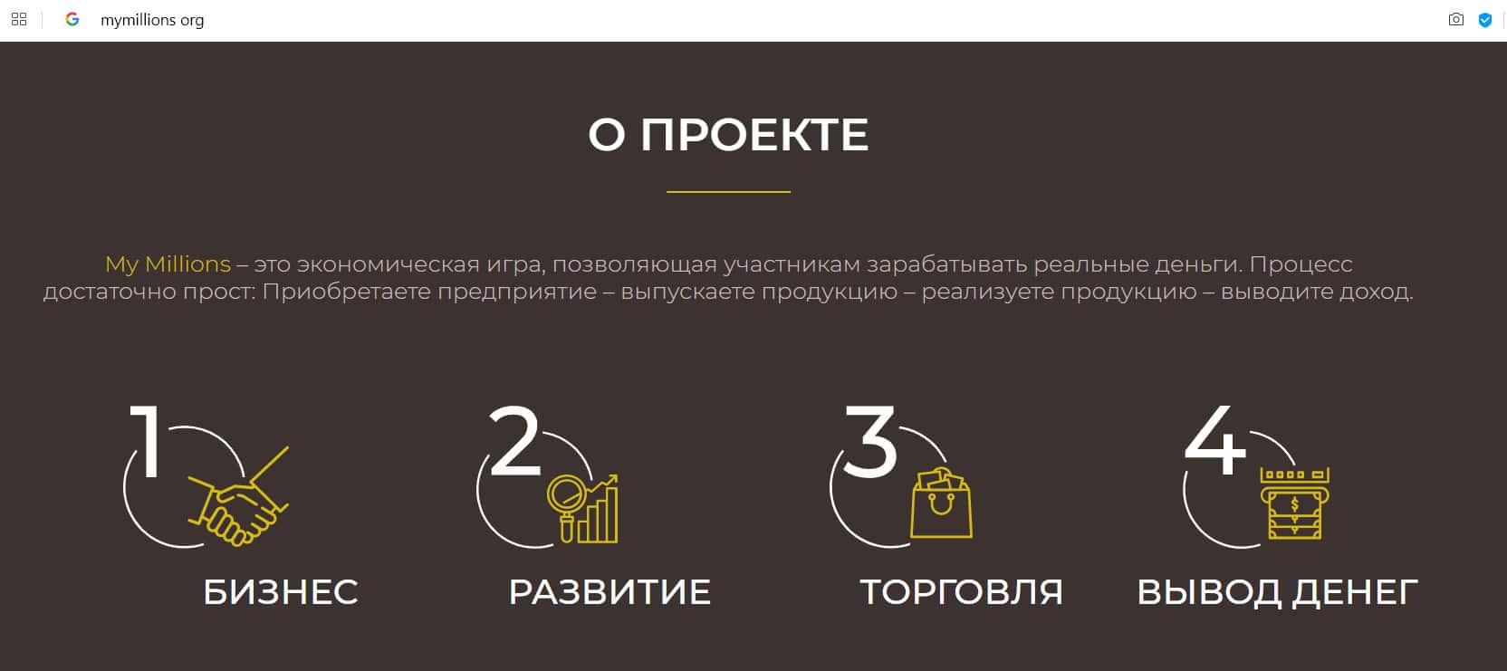 В разделе сайта под названием О проекте организаторы расписывают, какая замечательная игра Май Миллионс и как легко здесь заработать без вложений. Пишется о продуманной экономике и безопасной работе, а также об открытой статистике. Абсолютно пустые фразы без конкретных подтверждений.