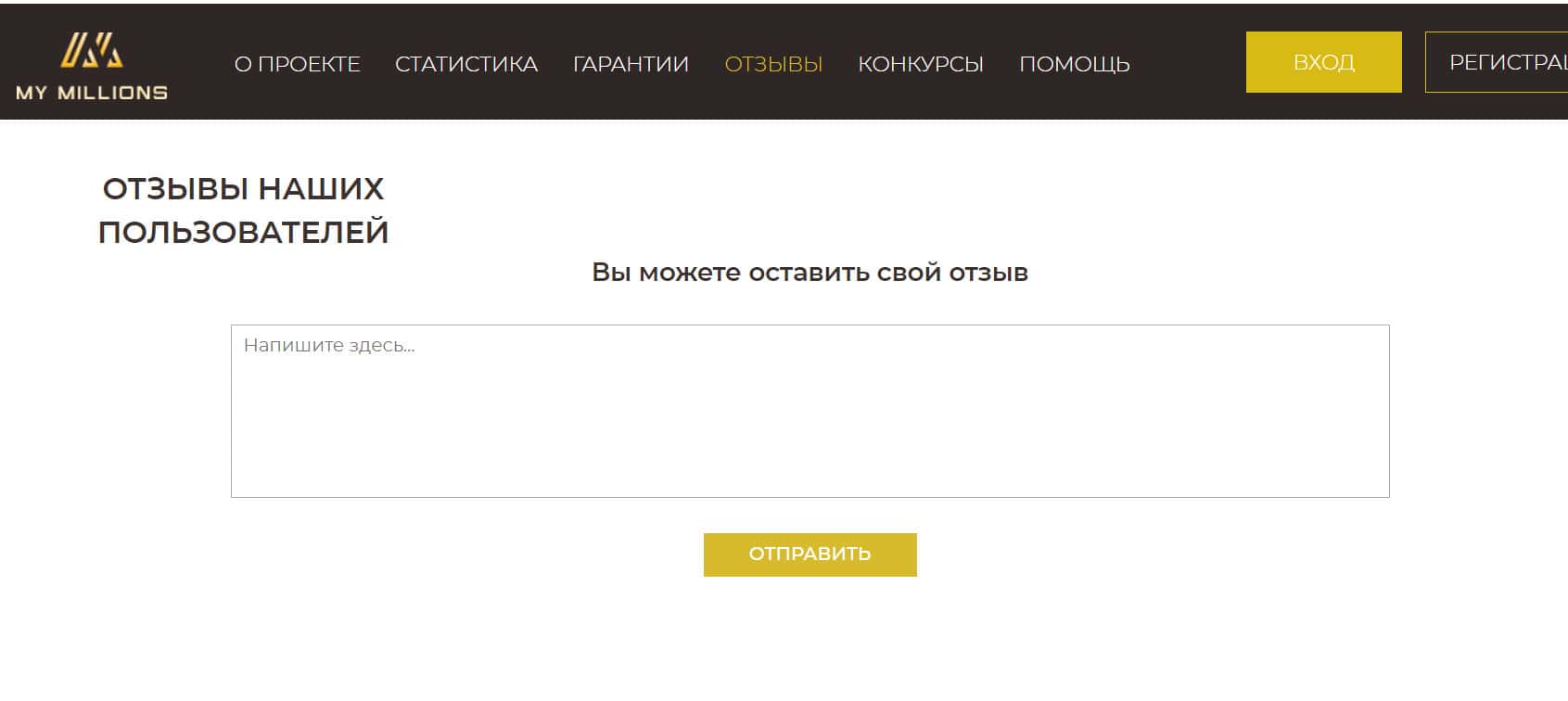 Владельцы скам проекта Май Миллионс удаляют отзывы о своей компании, потому что подавляющее большинство из них будут негативными. На из сайте есть раздел Отзывы, но, если вы зайдете туда, увидите только окно с предложением оставить отзыв и больше ничего. Понятно, что жуликам не нужны плохие отзывы о себе.