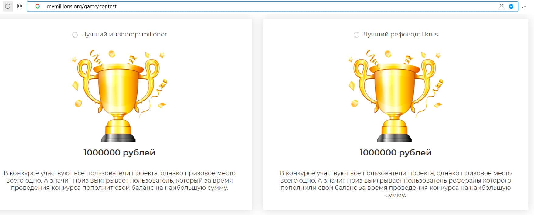Мошенники, создавшие игру Май Миллионс хотят привлечь как можно больше людей в их пирамиду, поэтому придумывают разные бонусы и конкурсы. То, что конкурсы фейковые, становится понятно уже из их условий. Призы на миллион рублей - это фейк, так как у проекта нет денег на их выплату.
