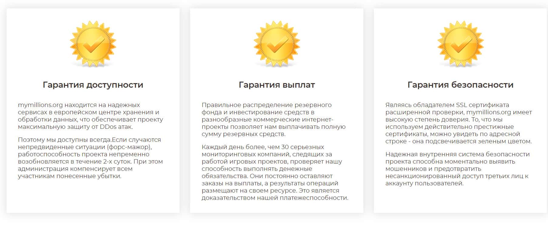 На сайте Май Миллионс есть красивый раздел Гарантии, где разработчики обещают игрокам всяческие гарантии, относительно безопасности, надежности и так далее. Однако, это просто слова, не имеющие ничего общего с действительностью. Стоит только почитать, что там написано, как становится понятно, что все - полная ложь.