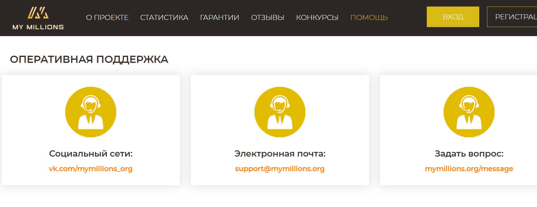 На сайте Май Миллионс для связи с техподдержкой имеется только имейл: support@mymillions org. Но очень сомнительно, что кто-то ответит, учитывая то, что выплаты участникам прекращены. Еще можно попробовать написать в мессенджер или в группу ВК: mymillions org/message.