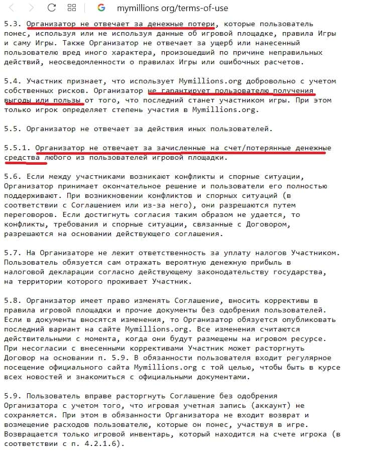 Клиентское соглашение проекта MyMillions - это очень интересный документ. Там прямым текстом написано, что организация не гарантирует игроку получение выгоды, а также не отвечает за зачисленные на площадку средства. Другими словами, с ними может происходить все, что угодно, даже обнуление.