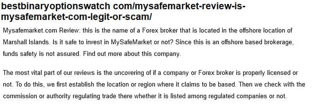 Хоть мошенники MySafeMarket и указывают адрес регистрации на Маршаловых островах, но вот какой-либо лицензии для работы на финансовых рынках у них нет вообще. Именно поэтому они и выбирают такие юрисдикции, потому что там слабо все контролируется. Даже на территории СНГ с этим все намного строже.