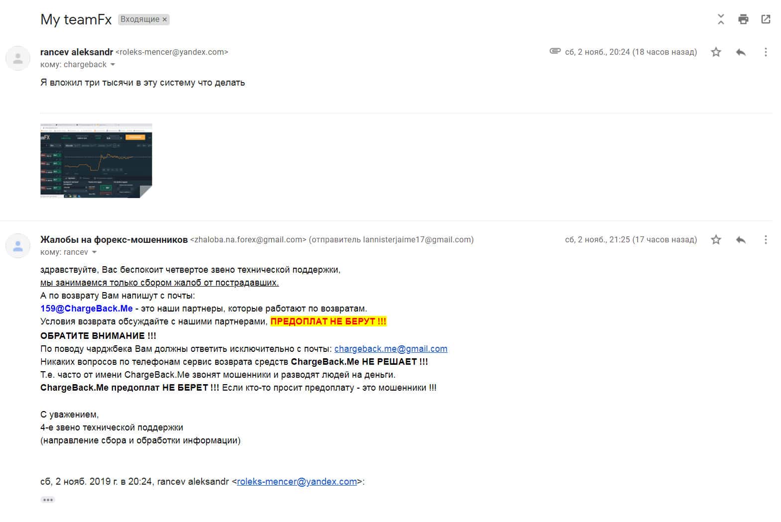 Далее предлагаем увидеть увеличенный скрин платформы MYteamFX, который был прикреплен к письму с жалобой.