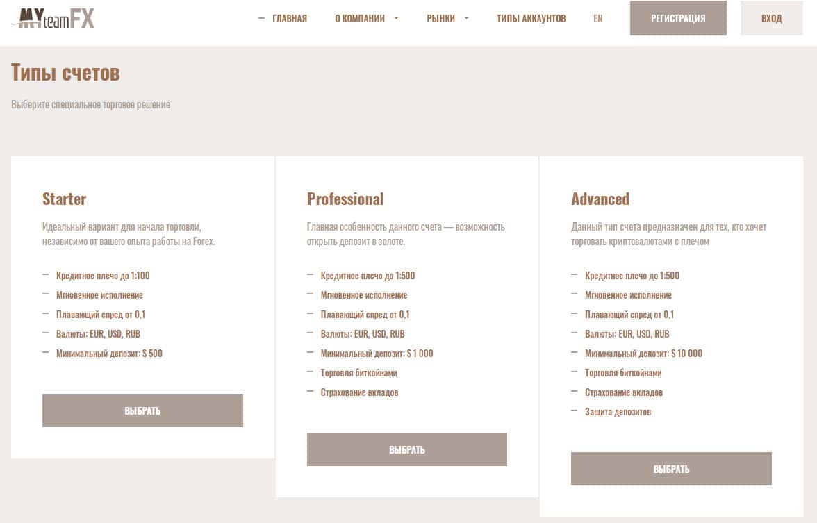 После на сайте у жуликов MYteamFX следует довольно типичный и банальный раздел с довольно устаревшим разделом сайта, в котором описываются типы торговых счетов мошенников МИ теам ФХ, по которым наивная клиентура должна будет вливать деньги в мошенническую аферистов MYteamFX в надежде на прибыль.