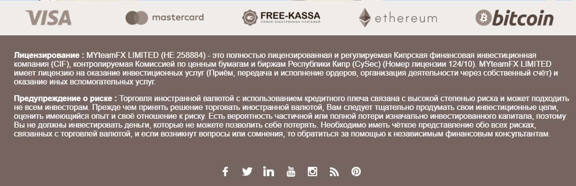 Несмотря на огромное количество лапши со стороны аферистов МИ теам ФХ о своей надежности тому подобного бреда, под предлогом которого мошенники MYteamFX будут пытаться развести клиентуру на ввод средств в свою помойку. Однако о самой же лицензии шулера МИ теам ФХ упоминают в конце своего сайта на картинке.