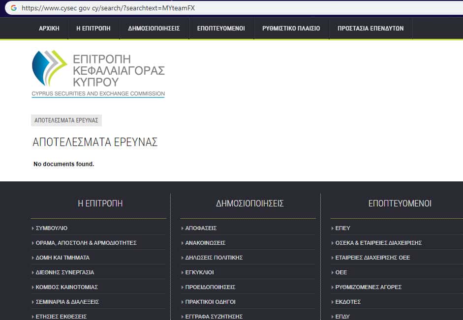 Однако даже при переходе на сам сайт данного регулятора о лохотроне МИ теам ФХ никакой информации на нем нету, что говорит о том, что мошенники MYteamFX попросту в очередной раз соврали наивной клиентуре. На изображении, расположенном ниже, вы можете увидеть результаты поиска аферистов МИ теам ФХ на сайте регулятора.