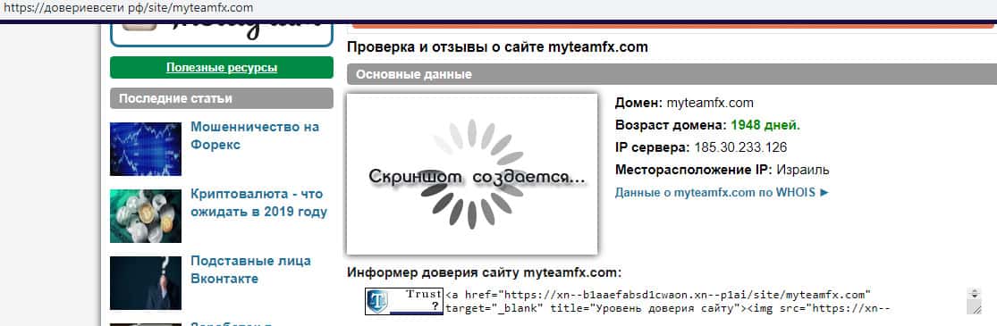 В связи с мошеннической и противозаконной деятельностью мошенников МИ теам ФХ их реальные руководители предпочитают анонимность дабы избежать ответственности со стороны правоохранительных органов. Техническую же информацию об аферистах MYteamFX можно узнать с помощью портала довериевсети рф, что вы можете прочесть ниже.