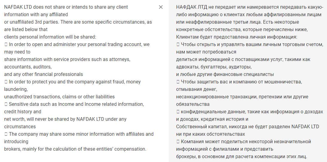 От политики конфиденциальности возникают какие-то двоякие чувства, так как лохотрон Нафдак написал его по двойным стандартам. Жулье указывает, что они ни при каких обстоятельствах не будут передавать личные данные клиентов и в тоже время есть список исключений и лазеек, через которые они смогут это сделать.