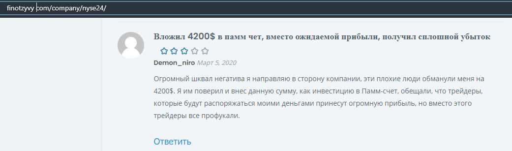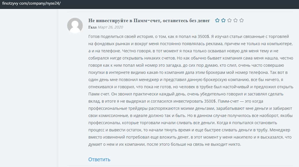 В данном отзыве клиент рассказал, как его обворовали в конторе NYSE24 на 3500 долларов. Аферисты предложили инвестировать деньги в ПАММ-счет и это была ошибка.