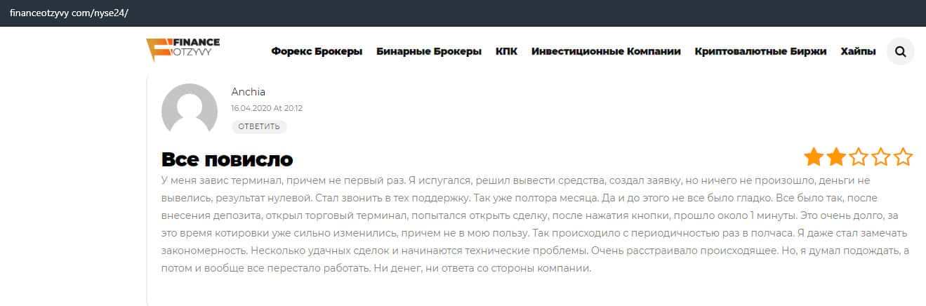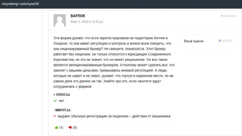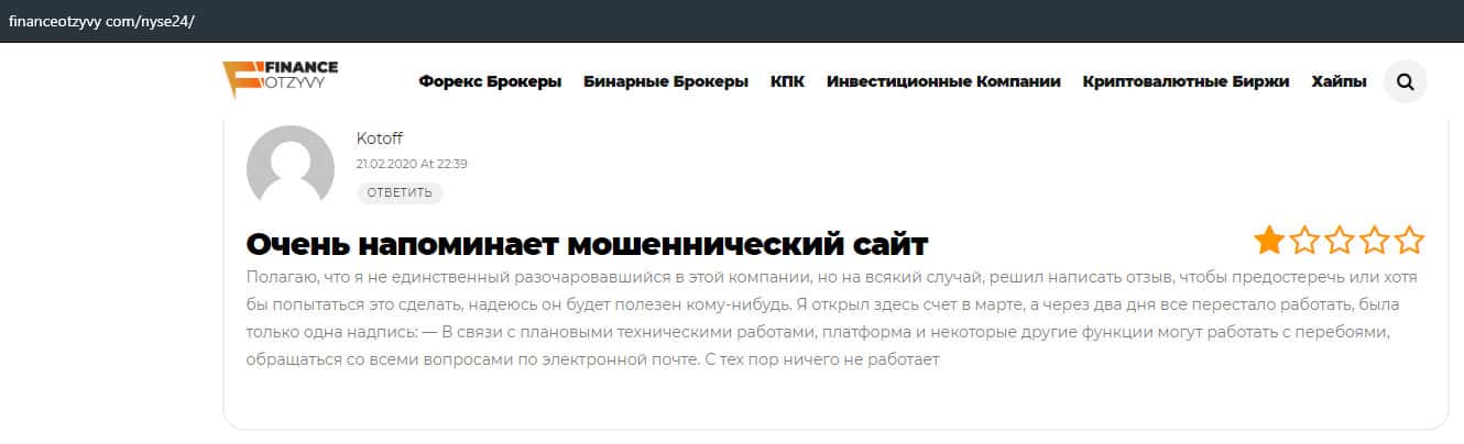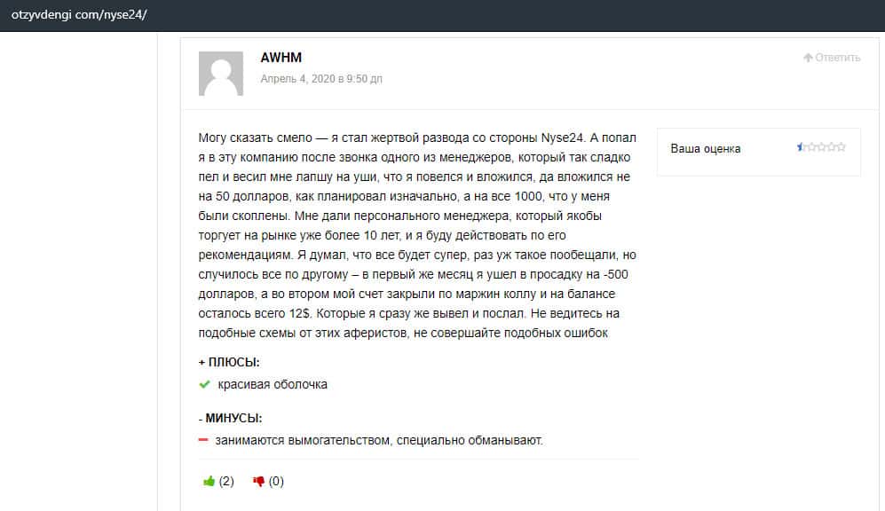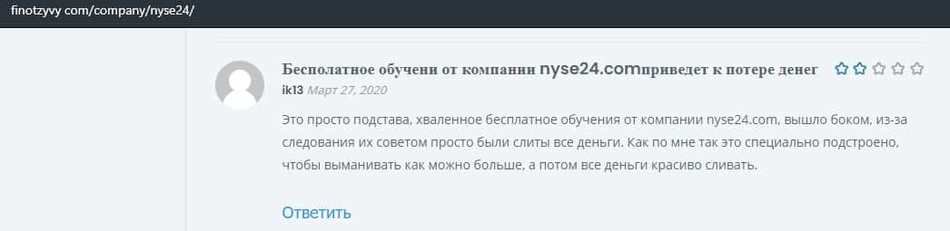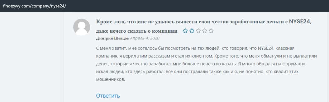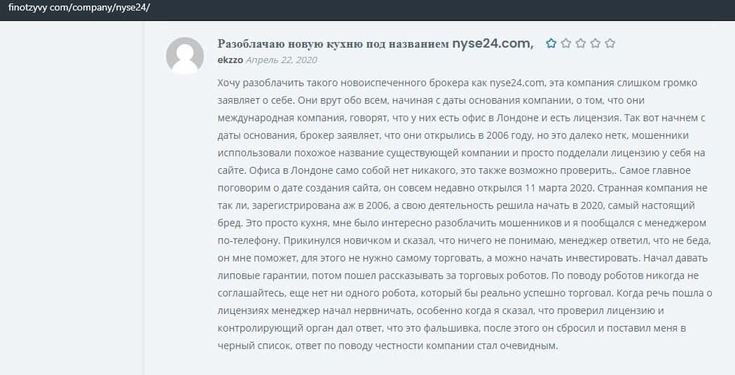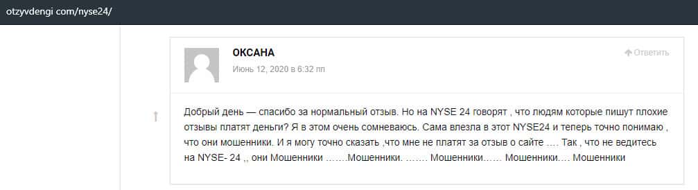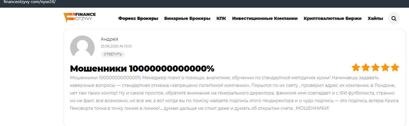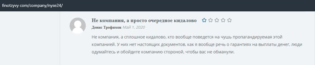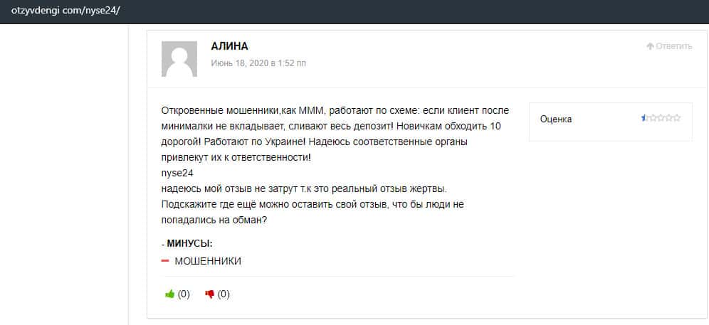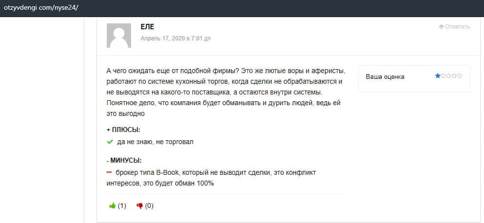 Далее представлен отзыв, в котором автор разоблачает кухню NYSE24. Эта конторка очень громко о себе заявляет, хотя не стоит и цента, поэтому обходите ее десятой дорогой.