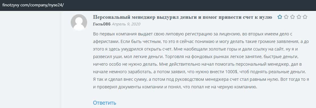 Персональный менеджер конторы NYSE24 занимается обыкновенным выманиванием денег со своей клиентуры и после этого помогает как можно скорее привести счет к нулю.