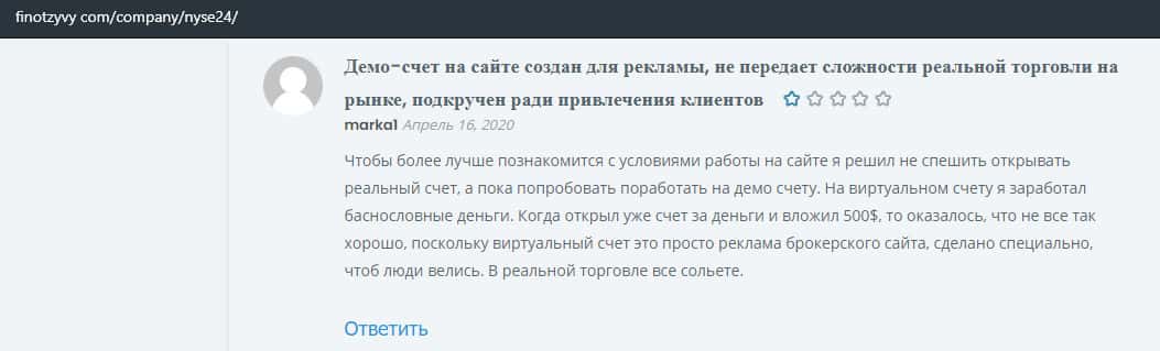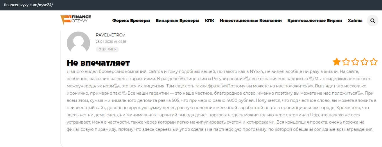 Человек в своем отзыве рассказал, что его не впечатляют условия, которые предлагает компания NYSE24. Они указывают минимальный депозит 50 долларов, а значит они кухня.