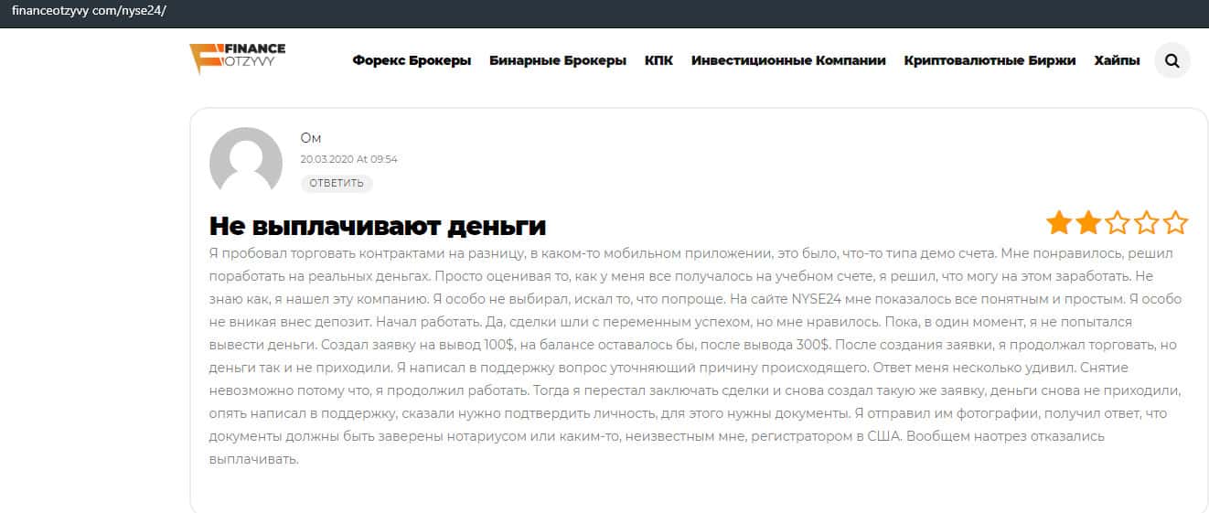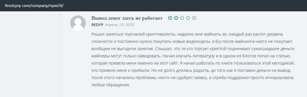 Человек рассказал в своем отзыве, что мошенники NYSE24 не дают возможность выводить средства клиентам, при чем на это они готовы придумать какие хочешь отмазки.