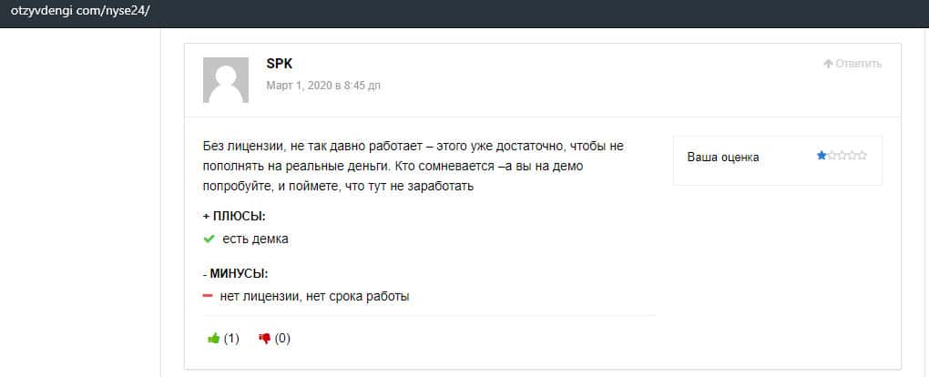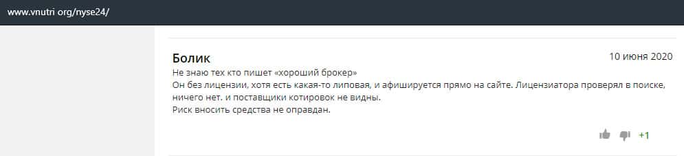 Очередной пользователь сети заметил, что контора NYSE24 никакой и не хороший брокер, так как он проверял их лицензию на специальном сайте и ее там не оказалось.