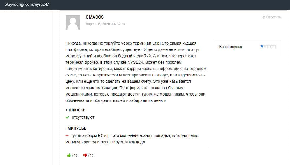 NYSE24 - очередная кухня-однодневка, которая была организована, дабы выманивать деньги из карманов наивной клиентуры под видом предоставления брокерских услуг. Аферисты используют мошенническую торговую платформу UTIP о которой уже все наслышаны. Мы настоятельно рекомендуем не связываться с ними, а тем более не вкладывать туда свои деньги.