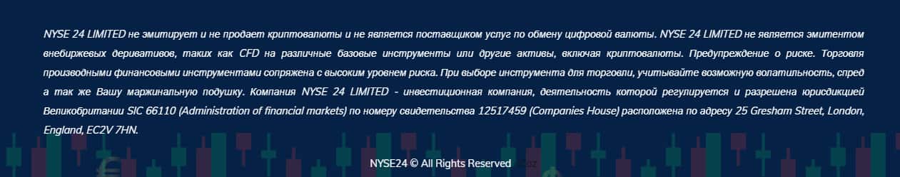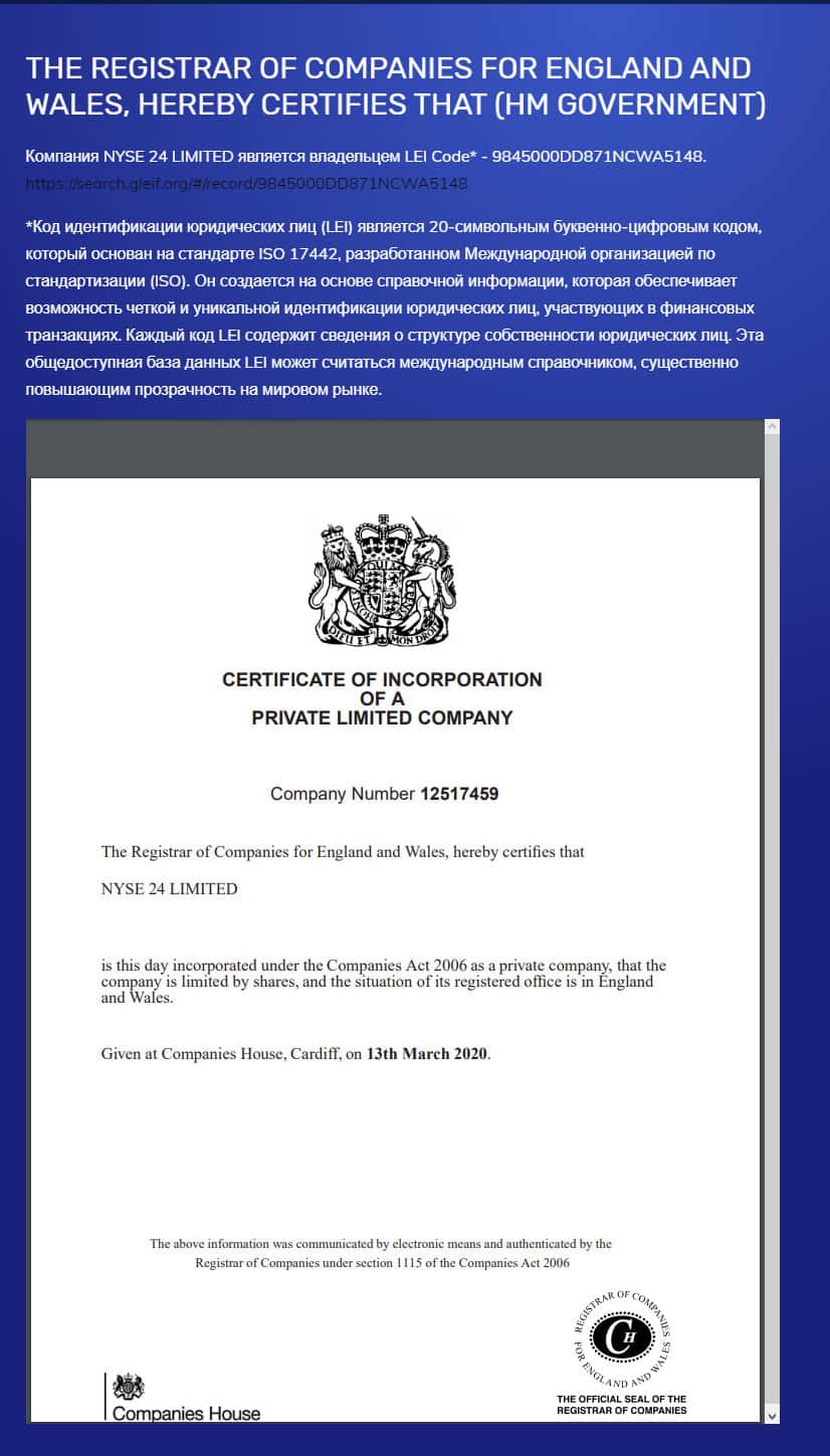 Брокерской конторой NYSE24 управляет некая компания под названием NYSE 24 LIMITED, которая якобы зарегистрирована в Великобритании и имеет регистрационный номер 12517459.