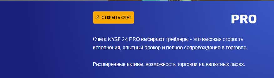 Шарлатанская организация NYSE24 использует замануху для профессиональных трейдеров в виде счета PRO. Там якобы хорошие условия, но скорее-всего это неправда.
