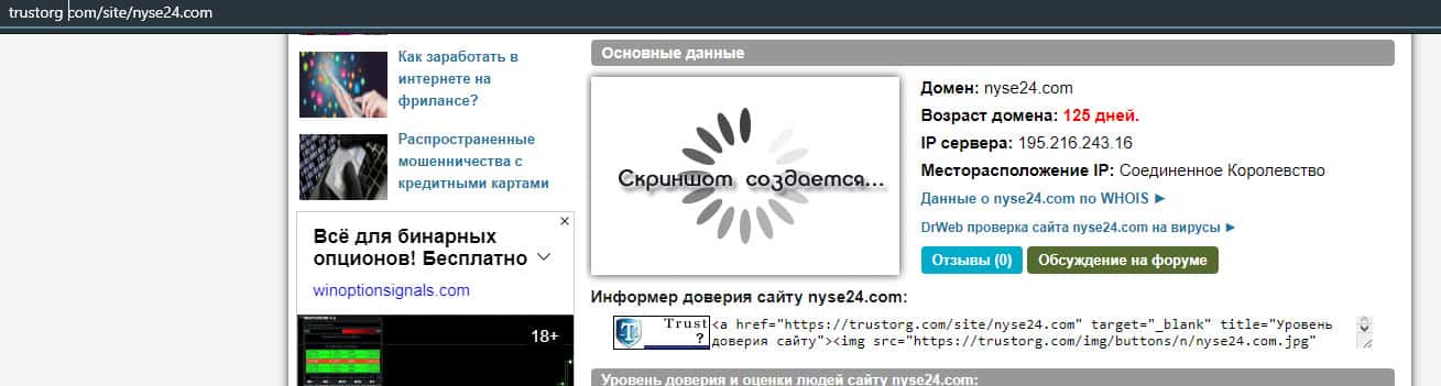 По поводу бренда сайта лохотрона "nyse24 com" без точки также сказать нечего, потому что аферисты не набрали по этому параметру ни одного запроса.