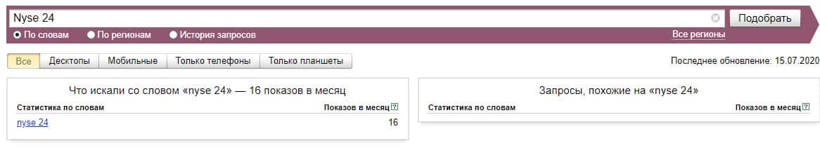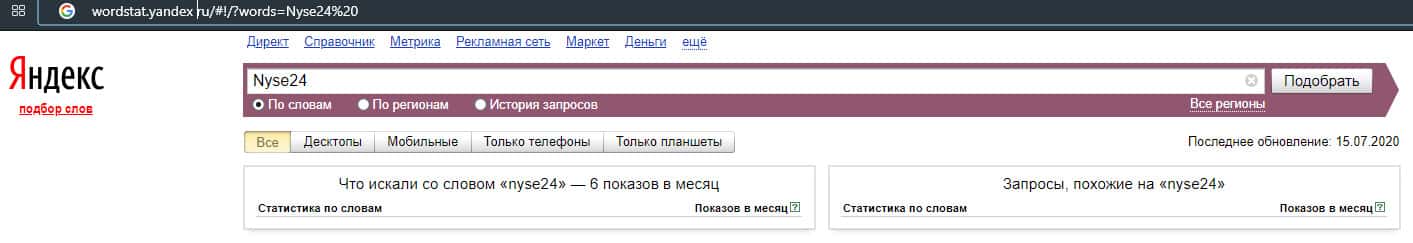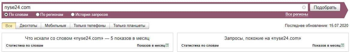 Запрос бренда "nyse24 com" по версии Яндекс.Вордстат нашел всего-то 5 показов в месяц, что показывает их очень низкую популярность в интернете.