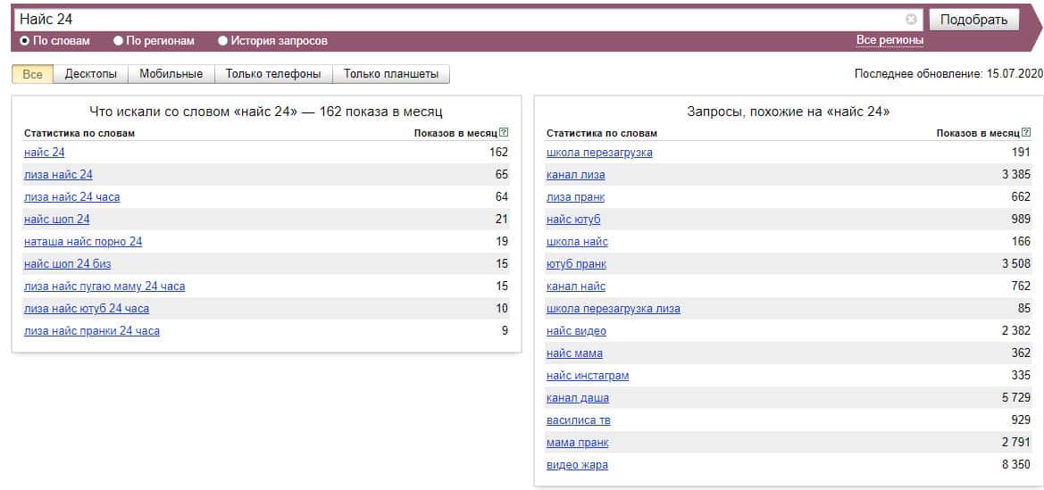 - Запросы Найс 24 по версии Яндекс.Вордстат