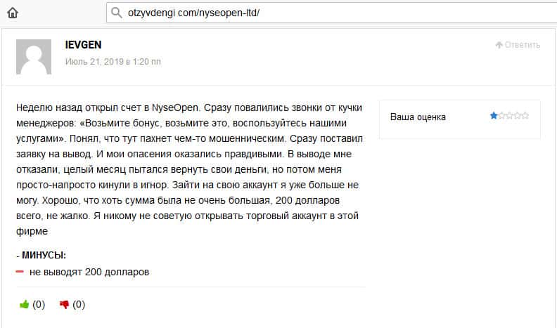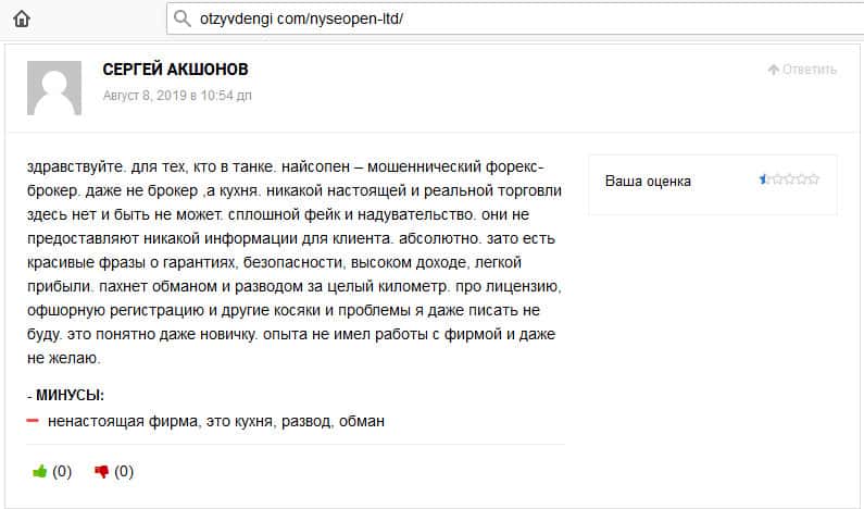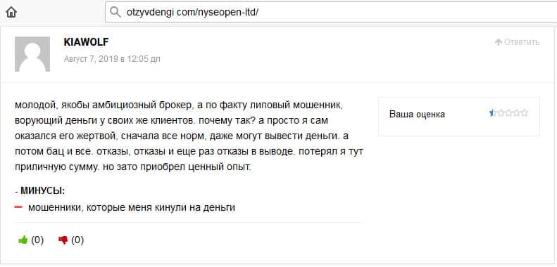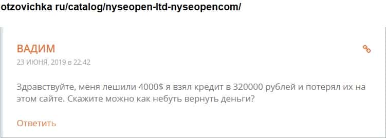 - NyseOpen - классический псевдоброкер, который занимается мошеннической деятельностью