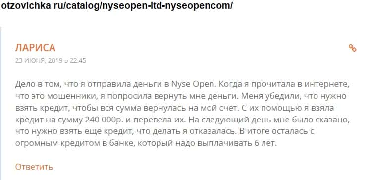 На кредитные средства никогда не нужно заниматься такими вложениями денег. Мошенники NyseOpen уговорили клиента взять такую большую сумму и вложить в их лохотрон. В итоге все это закончилось печально - выплачивать кредит придется еще целых 6 лет. И это частое окончание историй в работе с такими лохотронами. Жаль, что люди читают отзывы в последний момент.