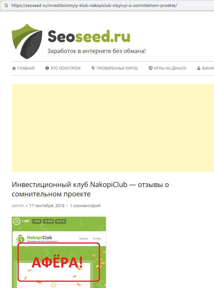 Одним из немногих, честно говоривших с самого начала проекта НакопиКлуб о его мошеннической направленности и не рекомендовавший инвестировать в копилку денежные средства является портал seoseed ru. Он сразу заявил, что инвестиционный клуб НакопиКлуб - сомнительная афера, представляющая собой обычную финансовую пирамиду, нацеленную на краткосрочный хайп.