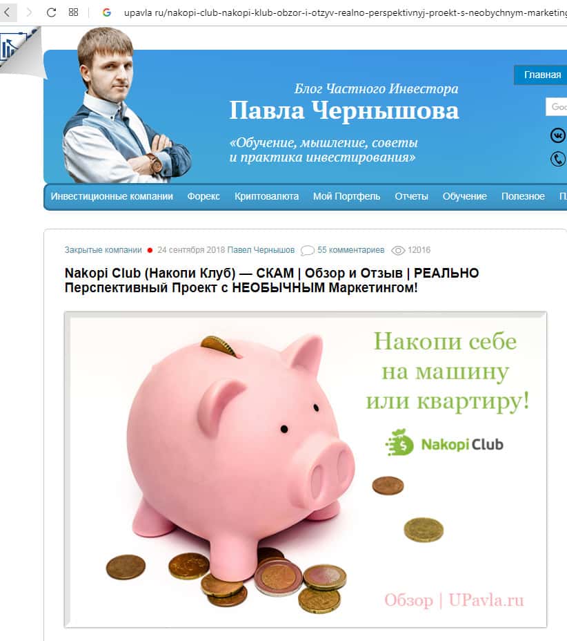 В своем блоге на сайте Павел Чернышов написал статью о проекте Накопи Клуб, расхваливая на все стороны и предрекая проекту долгую жизнь. Рекламирую проект, Павел предлагал регистрироваться по его рефферальным ссылкам. Через 5 месяцев проект соскамился, пирамида истощилась, и Павел, признав скам, теперь реламирует другие мошеннические проекты.