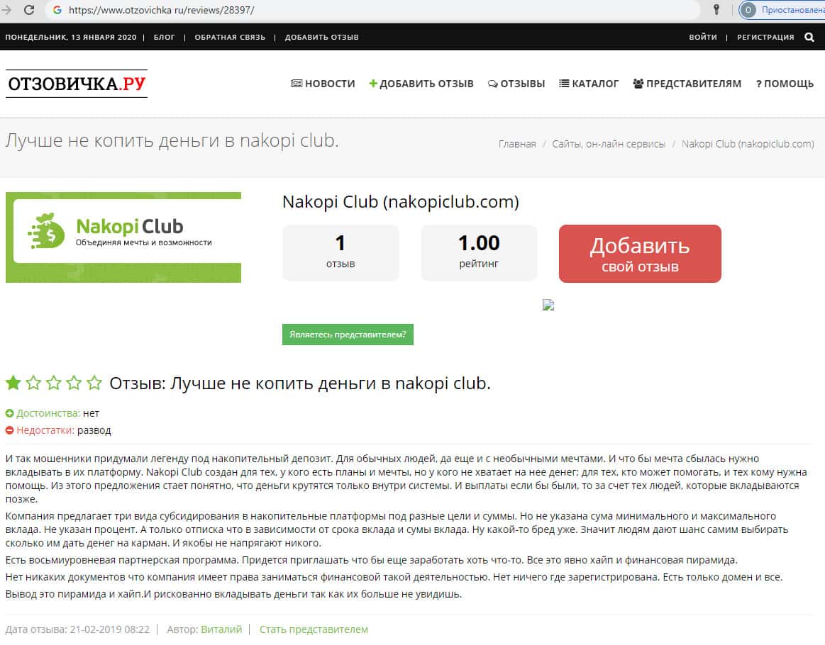 Отзыв Виталия на otzovichka ru с предупреждением относительно сути проекта НакопиКлуб