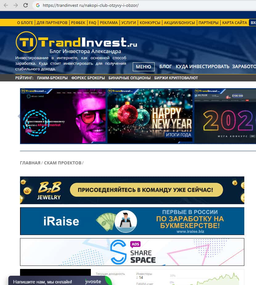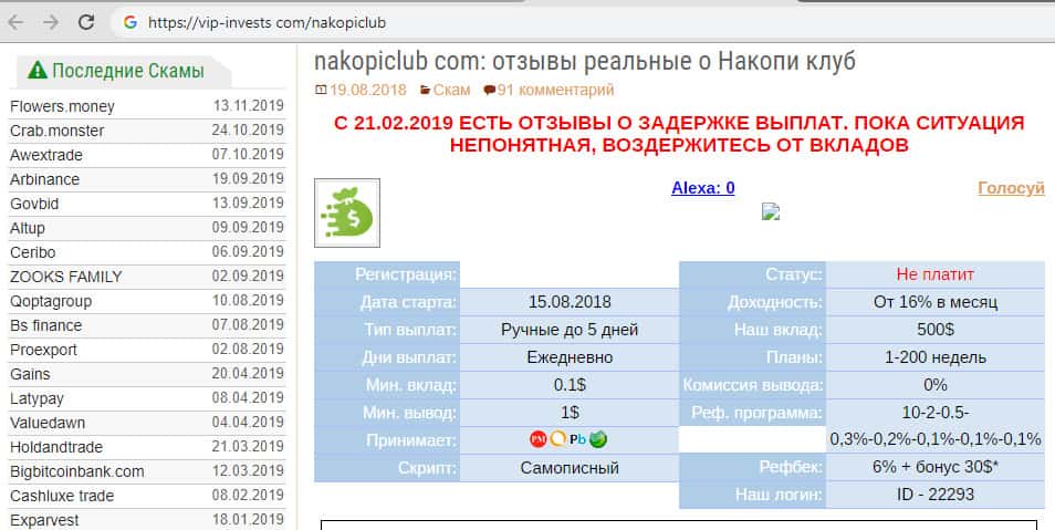 Удивили своим скамом и основателя блога на портале trandinvest ru Александра. Описывая накопительный проект НакопиКлуб, Александр описывал множество преимуществ копилки, особо хвалил подход к партнерской программе и маркетингу, и очень был раздосадован преждевременным скамом проекта, опередившем прогноз Александра на несколько лет.