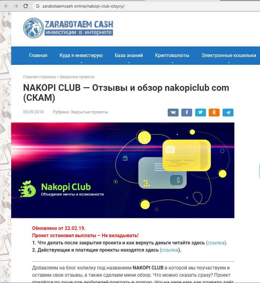 О несбывшихся прогнозах и невернувшихся инвестициях с проекта НакопиКлуб на портале zarabotaemcash online