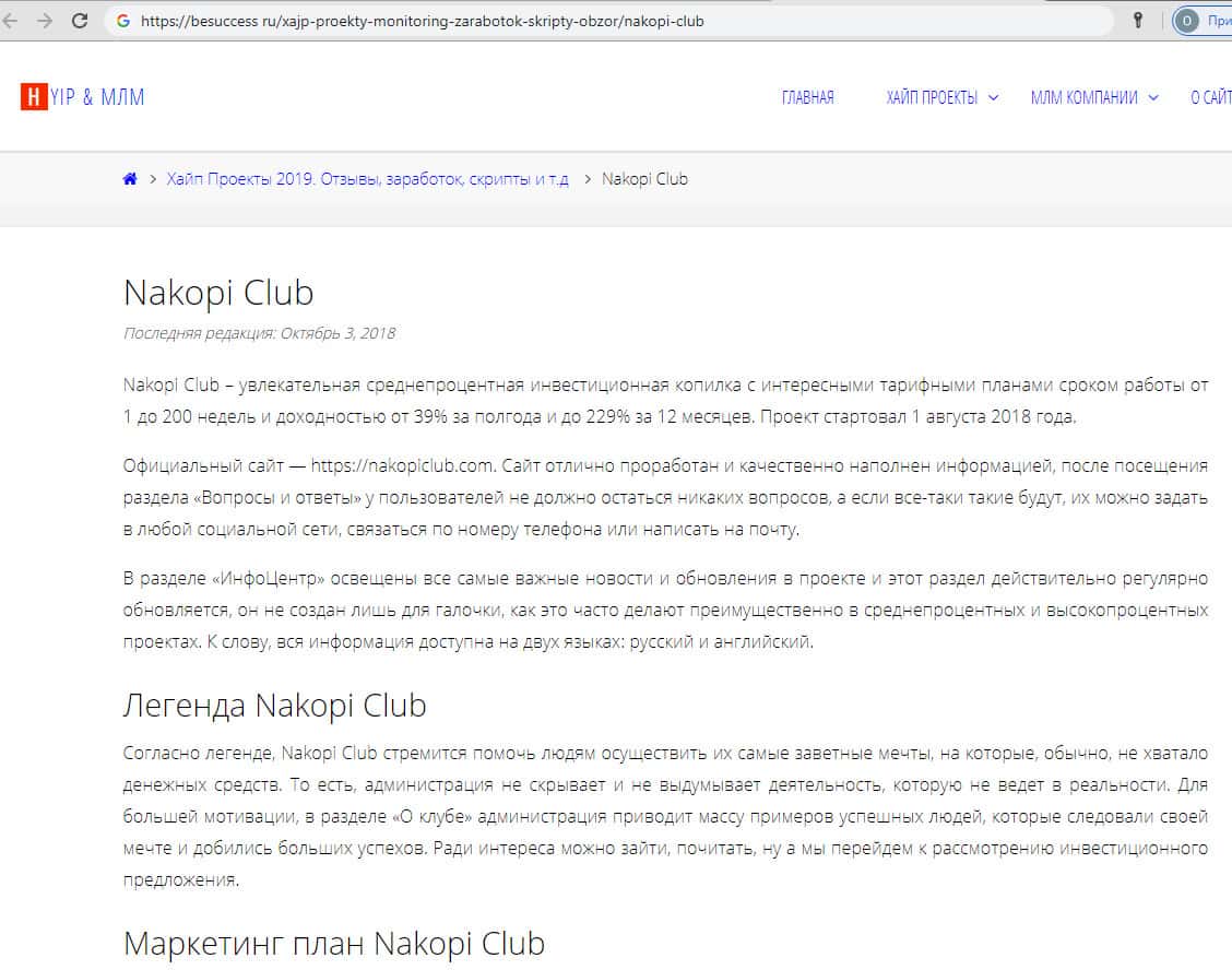 - Положительный обзор хайпа НакопиКлуб на портале besuccess ru с рекомендацией тщательно обдумать свои инвестиции в проект
