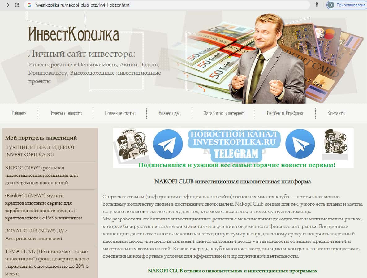 Блогер-инвестор Алексей Викторович решил личным примером привлечь новых клиентов на сомнительный инвестиционный проект НакопиКлуб. Он расхваливает на своем блоге investkopilka ru проект НакопиКлуб и агитирует последовать его примеру, и поучаствовать в проекте, зарегистрировавшись по его реферальной ссылке.