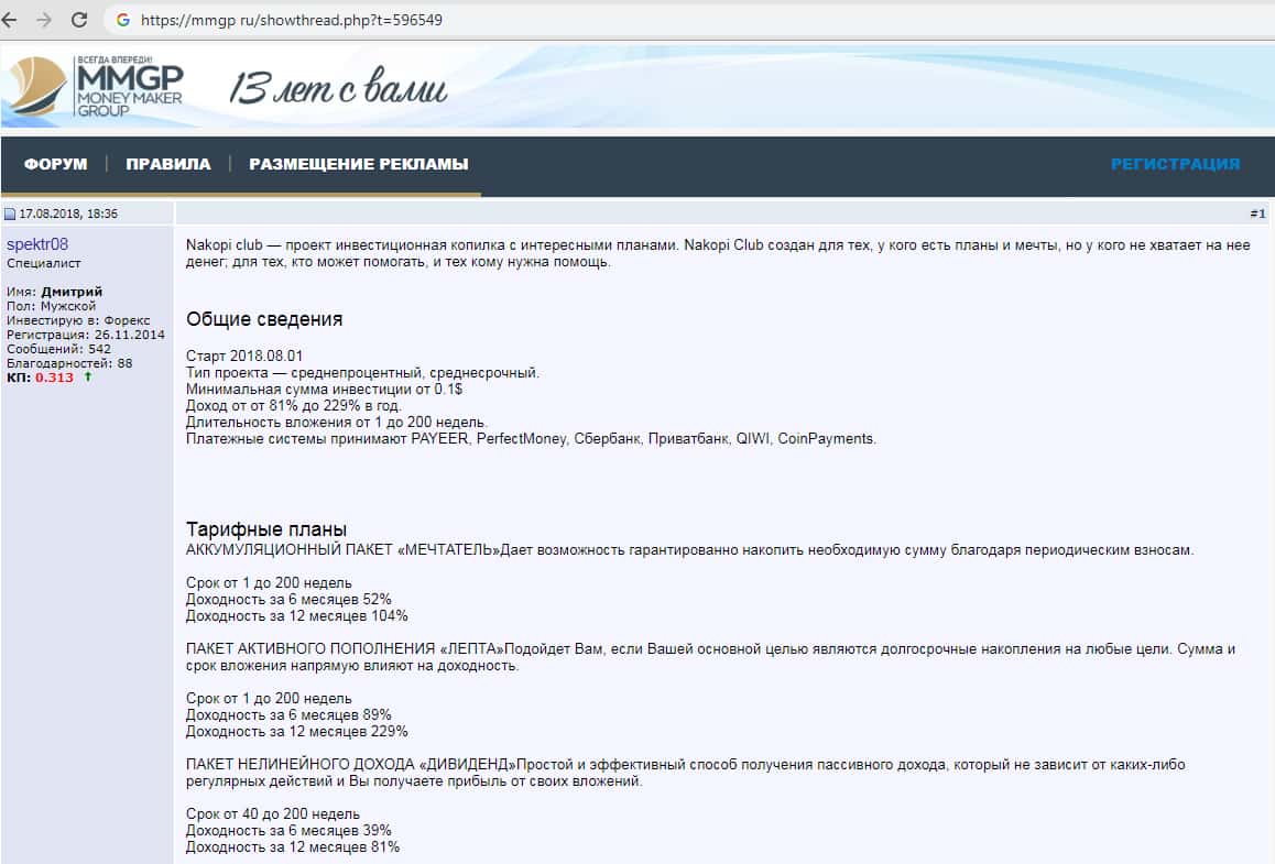 На портале Money Maker Group (mmgp ru) одна из веток форум.была посвящена проекту накопиклуб ком. Согласно данным, полученным с форума этот проект был запущен 1 августа 2018 года и представлял собой инвестиционную копилку с довольно высокими процентами дохода. Проект имел три тарифных плана: "Мечтатель", "Лепта" и "Дивиденд".