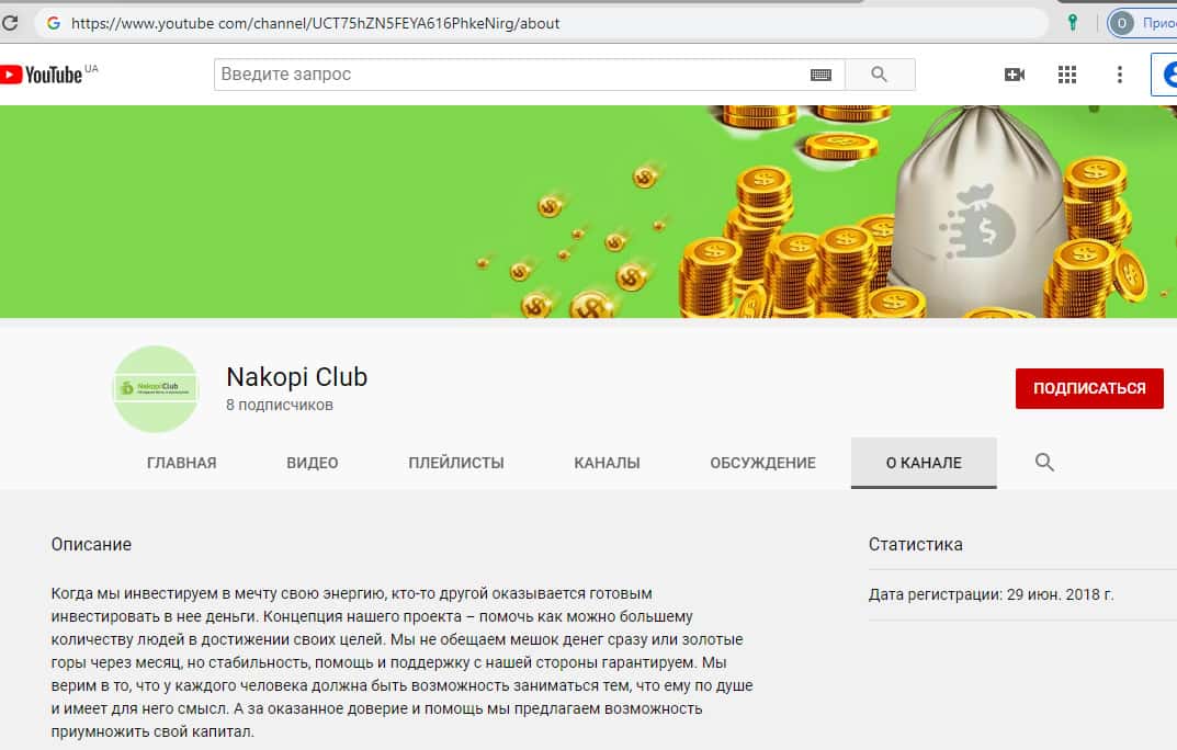 YouTube-канал мошеннического проекта НакопиКлуб был открыт ещё перед стартом проекта в сети. На него подписалось аж восемь подписчиков (наверное сами мошенники). Но канал девственно чист, на него так и не разместили никакой видеоинформации, поэтому, видимо и не стали его удалять, а просто забыли о его существовании.