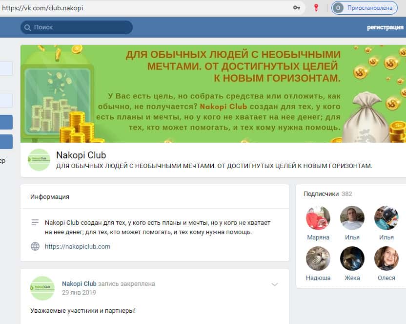 Страница аферистов Накопи Клуб в социальной сети ВКонтакте