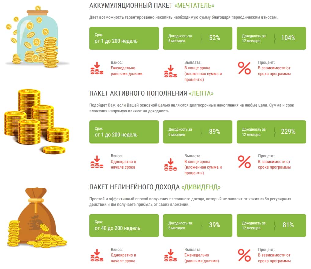 Два первых тарифных плана имели возможность определения срока инвестирования от 1 до 200 недель и заявляли доходность за полгода 52 и 89 процентов и год 104 и 229 процентов соответственно. Третий тарифный план имел срок от 40 недель с доходностью 39 и 81% за полгода и год соответственно. Но, просуществовав полгода, проект соскамился и закрылся.