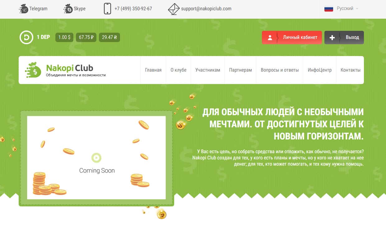NAKOPICLUB - мошенники и аферисты! Используя принципы построения финансовых пирамид мошенники организовали так называемую инвестиционную копилку. Но беда всех финансовых пирамид - зависимость от притока новых инвестиций, и неизбежный скам при падении уровня данного притока. Так случилось и с проектом НакопиКлуб. Никогда не поддавайтесь на предложения мошенников о легких заработках!