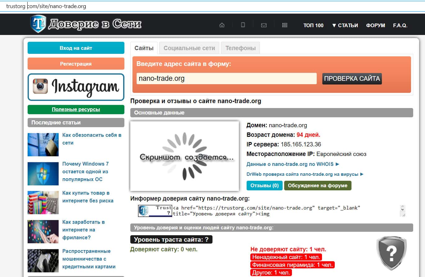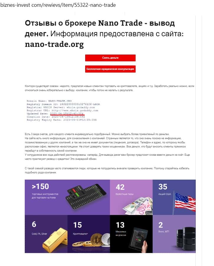 - Информация о сайте мошеннической конторы Нано Трейд