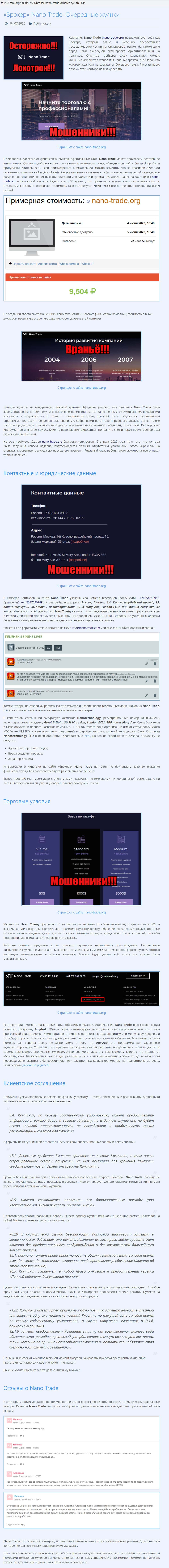 Далее предлагаем ознакомится с обзором мошеннической брокерской организации Нано Трейд, который был найден на авторитетном интернет-источнике Форекс Скам Орг.
