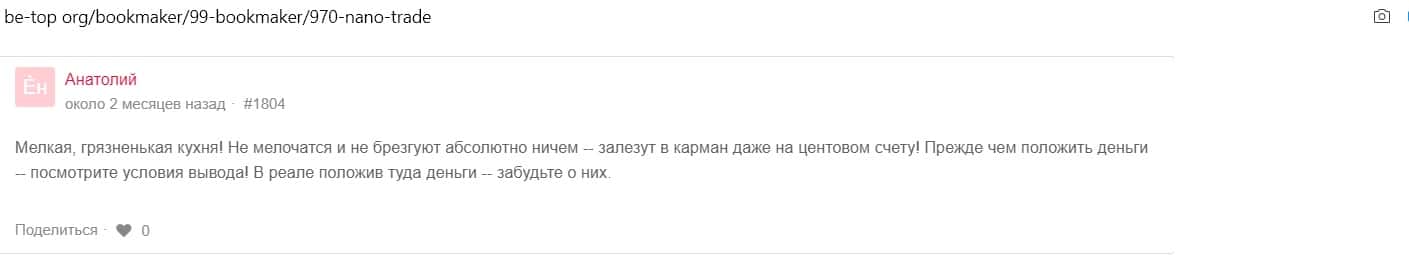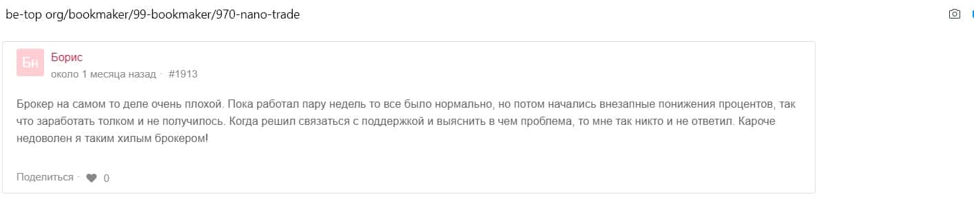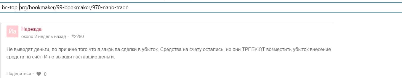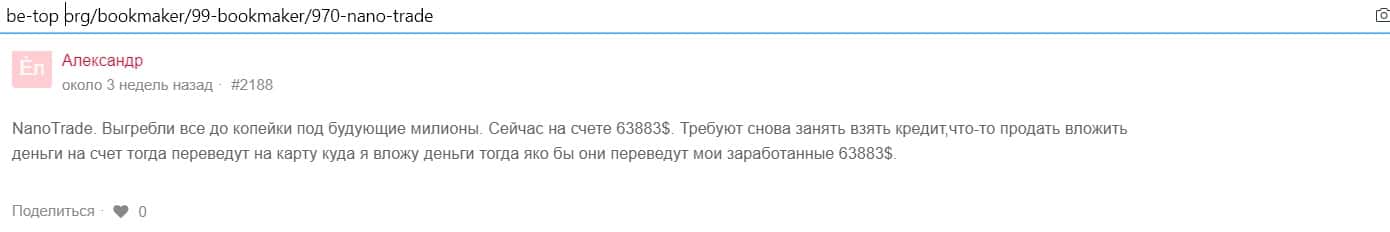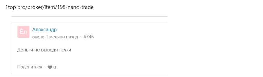 Александр оставил сообщение на сайте 1top pro, что брокер Нано Трейд - мошенник. Он не может вывести свой депозит с этой жульнической площадки.