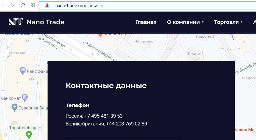 На мошенническом сайте компании Нано Трейд имеется два телефонных номера. Жулики могут звонить людям с московского номера, а также использовать другие номера.