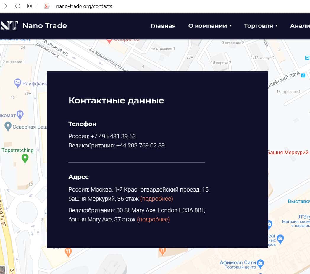 Мошенники, создавшие лохотрон Нано Трейд выложили адреса своих офисов. Один из них находится в Москве, а другой - в Лондоне. Скорее всего, оба адреса фальшивые.
