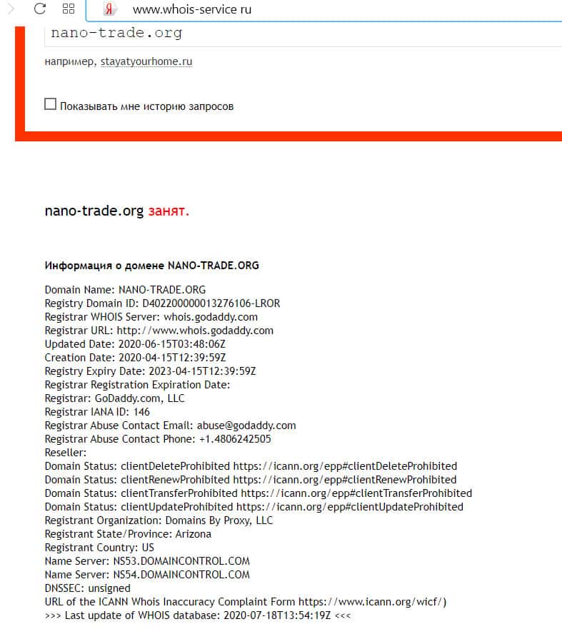 Кому принадлежит доменное имя nano-trade org?