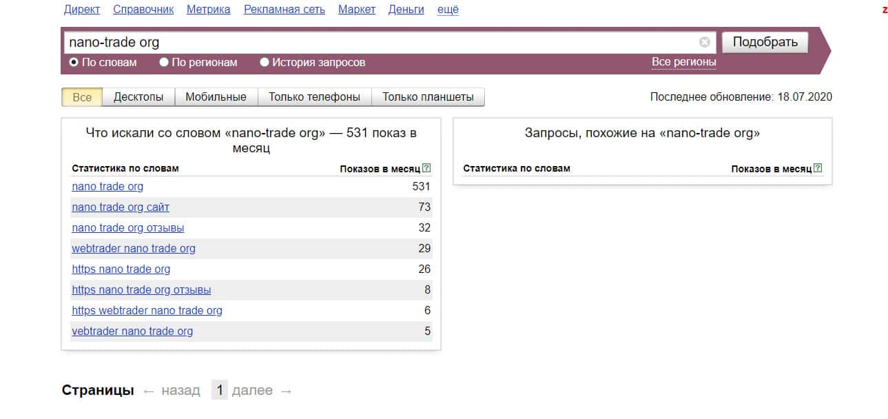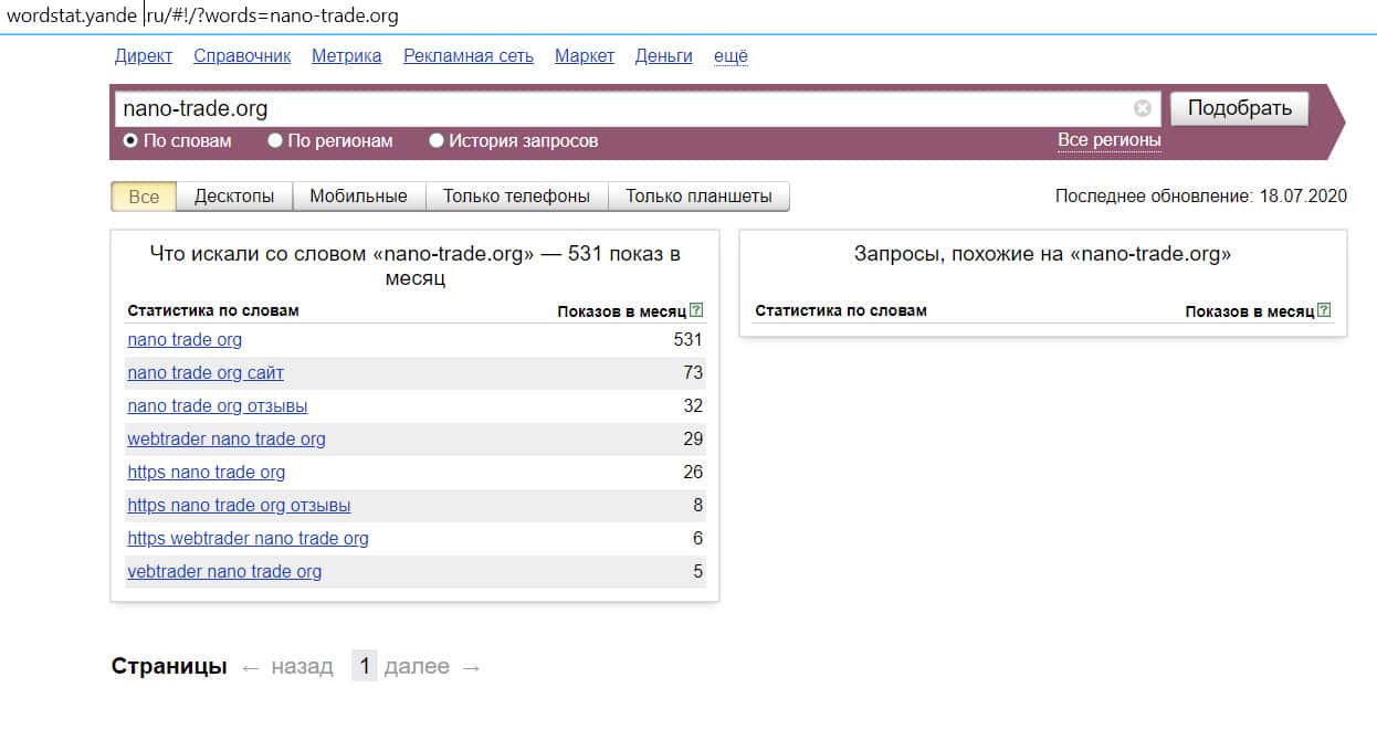 Число запросов по доменному имени "nano-trade org", написанного с пробелом без точки, по данным сервиса Яндекс Вордстат, составляет тоже 531 показ.